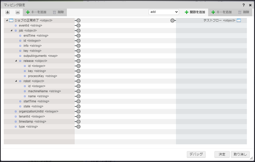 項目 説明 発生条件 カテゴリ「UiPath Webhook」に、「UiPath連携でのWebhook」に記載のイベントの種類に対応した条件を用意しています。このカテゴリ内で、反応したいWebhookイベントの種類を選択してください。マッピング設定 Webhookリクエスト内のペイロードに含まれる情報を、ロジックフローの入力値とマッピングできます。各イベントの種類のペイロードについては、UiPath Orchestratorのガイド内の以下のページを参照してください。